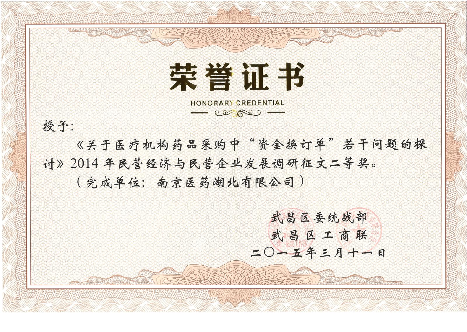 武昌区委统战部 武昌区工商联—民营经济与民营企业发展调研征文二等奖证书